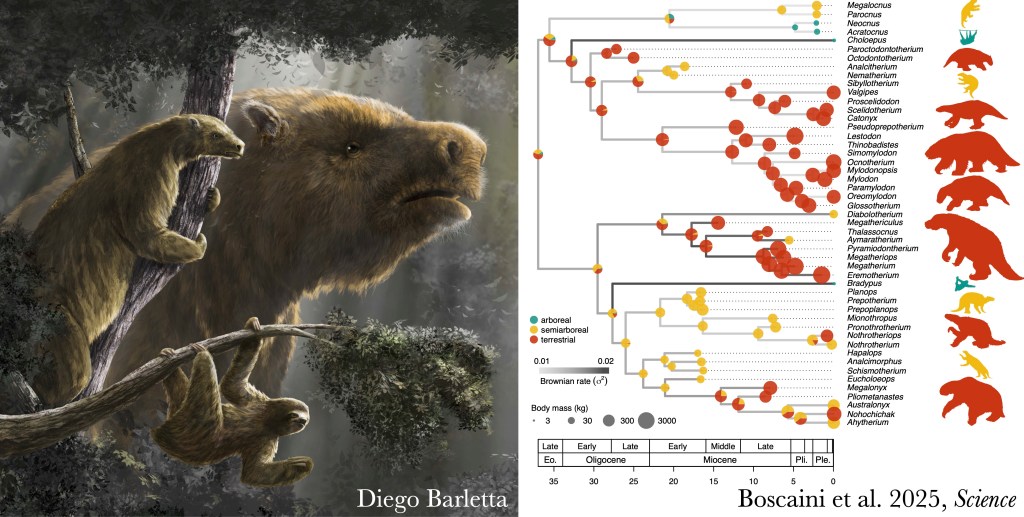 Analyzing the evolutionary dynamics of a large mammalian clade offers the unique opportunity to elucidate evolutionary patterns that occurred in the deep past. In recent years, we investigated the morphological disparity and the evolution of body size in the sloth lineage, shedding light on the tempo and mode of major transitions in their lifestyle (Casali et al. 2023; Boscaini et al. 2025).